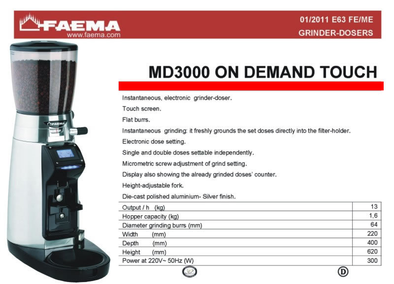 觸控螢幕..定量磨豆機(FAEMA-MD3000 O.D.Touch p)機身為鋁合金材質,義大利設計.外型優,質感佳..[水平式鈦鋼刀盤]多段式可調粗細,可設定單雙杯出粉時間,在兩者中間還有一個扭力彈簧來間接帶動下刀盤。